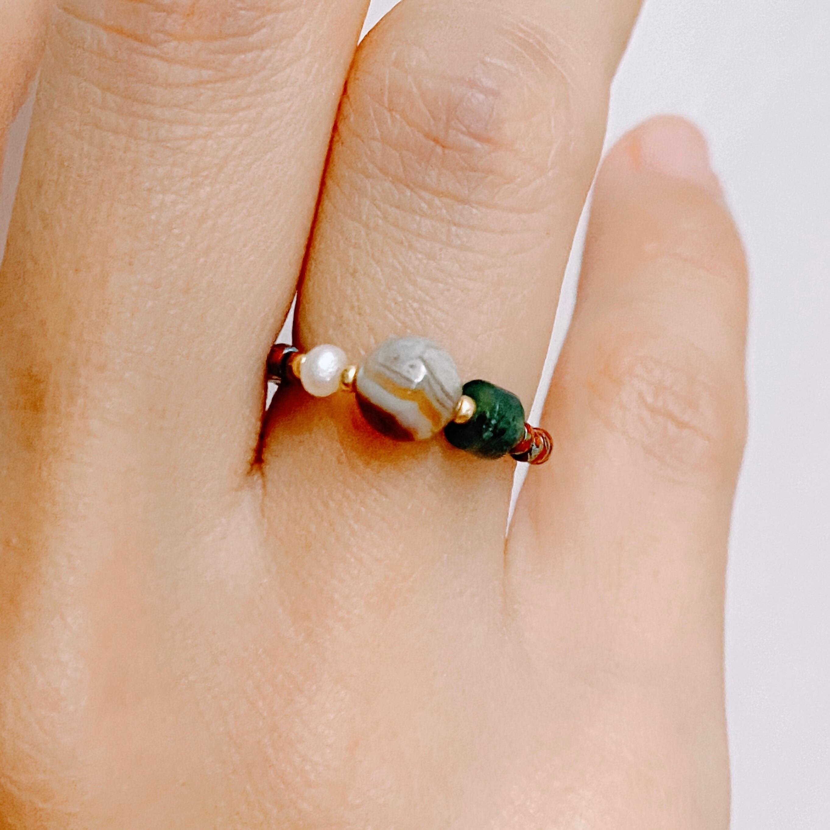 個性豊かな天然石とビーズを 一つ一つ繋ぎ合わせて指輪をつくりました。